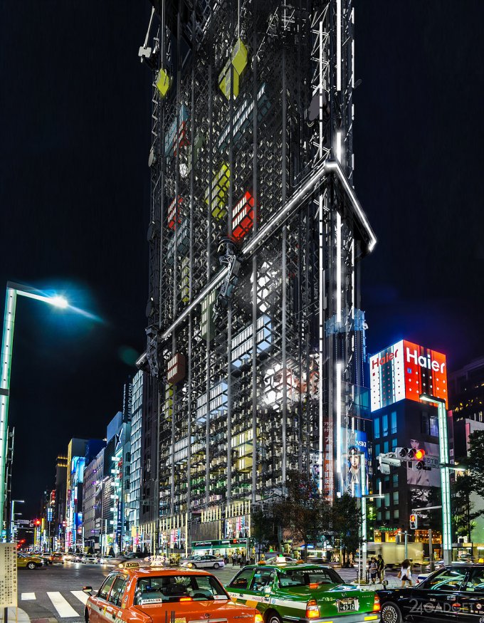 Само здание выполнено в формате каркаса с пустыми ячейками, в дальнейшем в них будут монтироваться «свежепостроенные» жилищные блоки. Специальные строительные 3D-аппараты предлагается установить на крыше небоскреба. Свою работу они начнут выполнять только после того, как покупатель выбрал и утвердил проект квартиры. По окончанию печати блоки с помощью кранов опустят на нужный этаж в пустую ячейку и там закрепят, подключит ко всем необходимым системам.