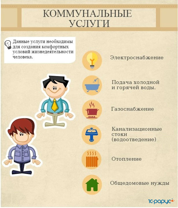 - Коммунальные услуги/оплата за коммунальные ресурсы. Данные услуги, в первую очередь, необходимы для создания комфортных условий жизнедеятельности человека. К ним относятся отопление, газоснабжение, электричество, водоснабжение и водоотведение.