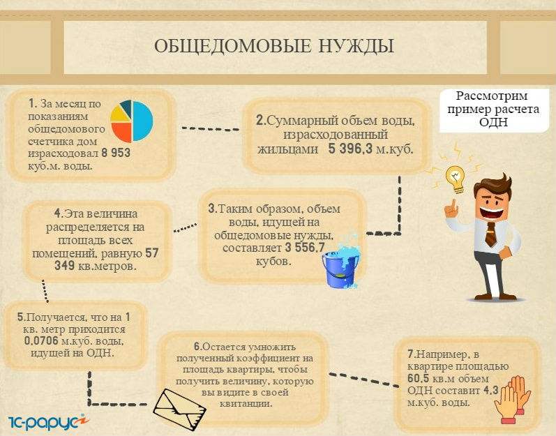 С осени 2012 года общедомовые расходы оплачиваются жильцами на основе показаний общедомовых счетчиков. Из этой величины вычитается сумма потребленного объема в жилых и нежилых помещениях. Полученная разница распределяется между гражданами пропорционально размеру площади принадлежащего помещения.