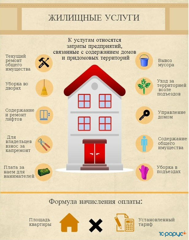 Коммунальные услуги включают подачу воды, газа, электричества и тепла, канализационные стоки (водоотведение) и общедомовые нужды. Тарифы и нормативы на эти ресурсы устанавливает государство.