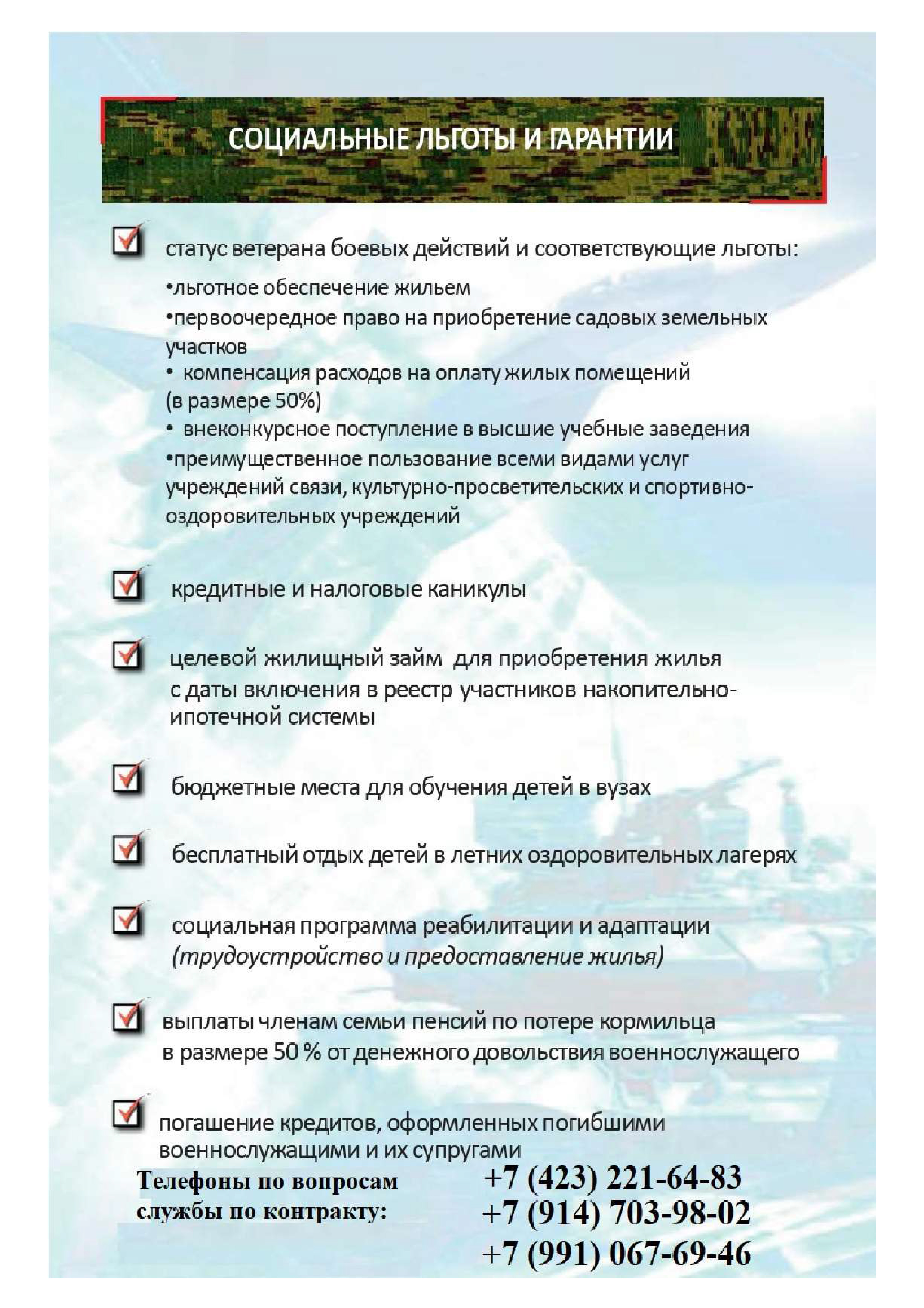 - При заключении контракта вам предоставляются все льготы военнослужащего Вооруженных сил Российской Федерации (льготное жилье, предоставление статуса «Ветеран боевых действий», льготы для детей при поступлении в ВУЗы и другие социальные льготы и гарантии, предусмотренные Федеральным законом «О статусе военнослужащих» от 27.05.1998 № 76-ФЗ).