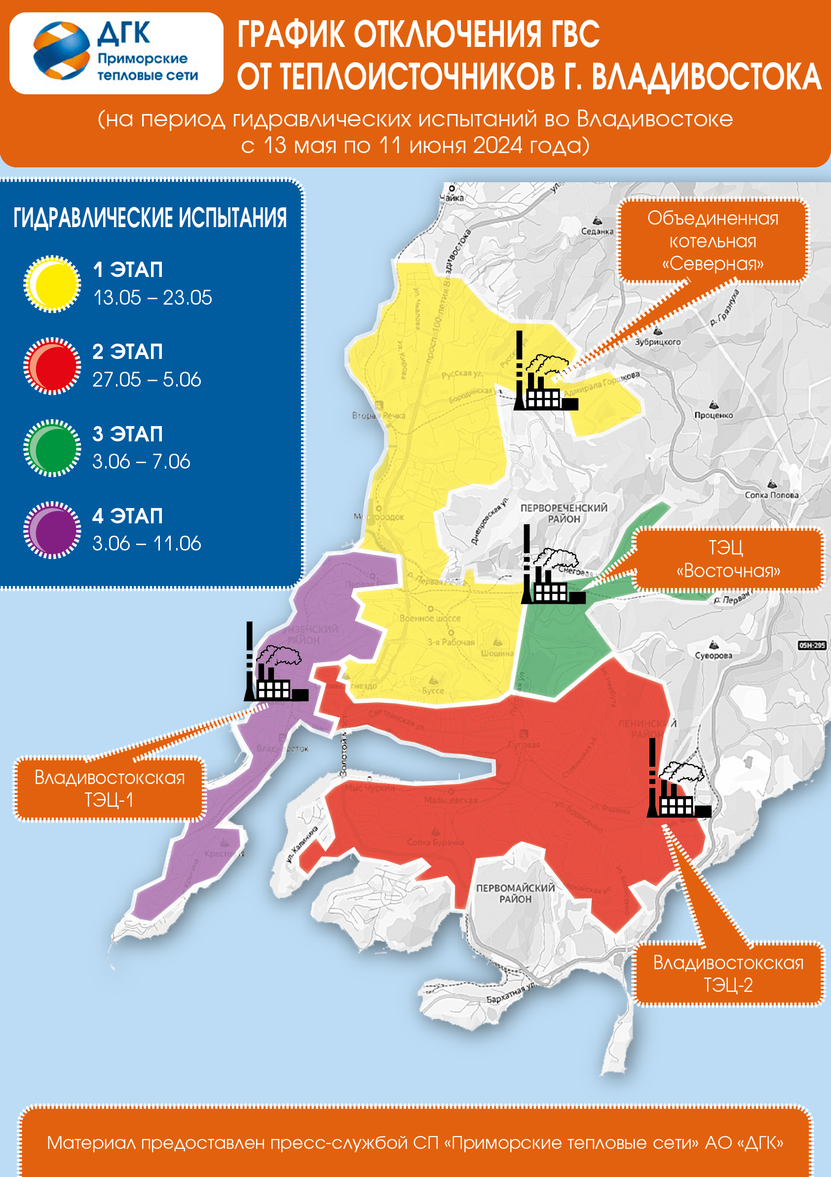 Третий этап пройдет с 3 по 7 июня горячее водоснабжение (ГВС) будет временно ограничено у части жителей Первореченского и Ленинского районов, получающих тепло от ТЭЦ «Восточная»: