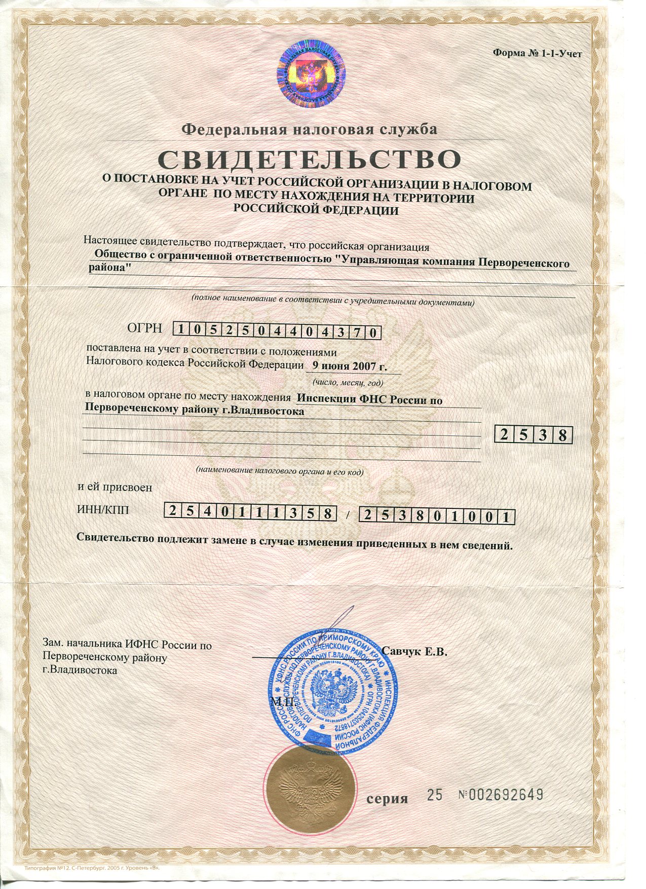 | 6 | Основной государственный регистрационный номер/основной государственный регистрационный номер индивидуального предпринимателя (ОГРН/ОГРП) | 1052504404370 |